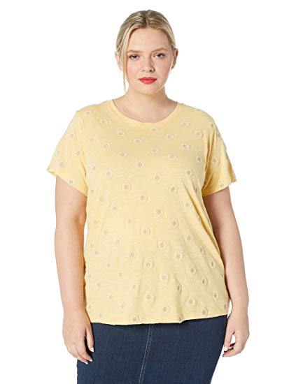 Plus size short sleeve scoop neck t shirt with all over daisy embroidery.