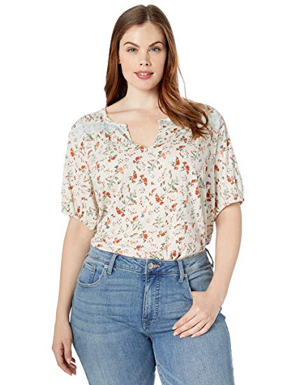 Plus size short sleeve notch neck peasant top with all over contrast floral print.