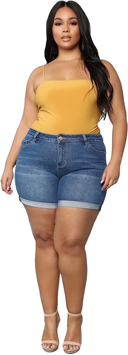 Plus Size Jean Shorts for Women Skinny Stretchy High Waisted Short Jeans Stretch Folded Hem Oversize Denim Shorts (Blue,Large)