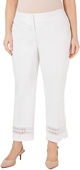 Alfani’s plus size pants feature a lace inset at the hem for an interesting spin—consider them your answer to warmer days Front rise: approx. 11-1/2″; back rise: approx. 19″ Zipper closure at front Invisible zipper pockets at front; welt pockets at back Lace inset at hem Cotton/rayon/spandex Machine washable Imported