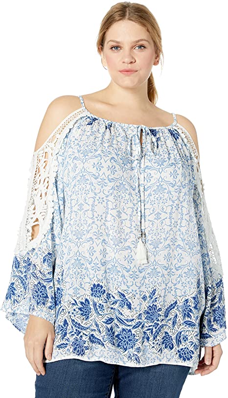 Angie women’s plus size long sleeve cold shoulder top with crochet and tie front detail.
