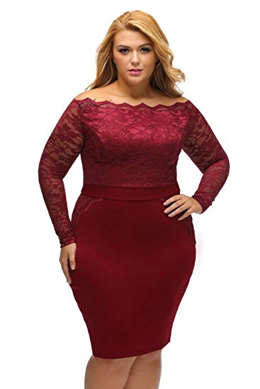 XAKALAKA Plus Size Long Sleeve Off Shoulder Lace Bodycon Cocktail Party Dress
