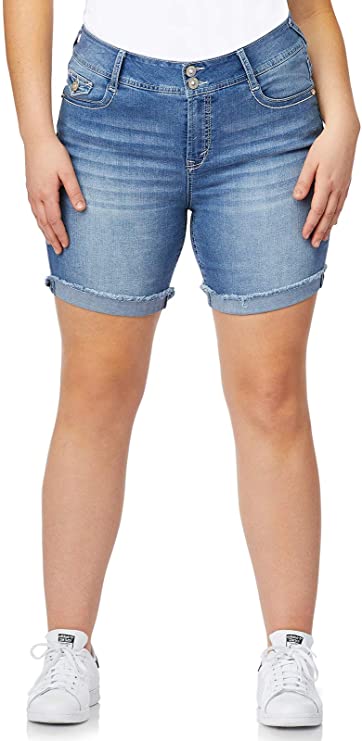 These Luscious Curvy midthighs feature embellished back pockets, ligth whiskering and rolled cuffed