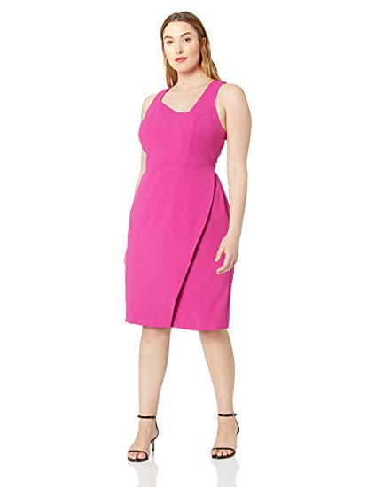 Scuba crepe midi dress with asymmetrical neckline and overlay skirt