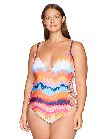 Tidal wave tie dye colored macrame side insets in a v neck plunge one piece swimsuit