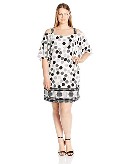 Polka dot printed shift dress featuring a cold shoulder sleeve