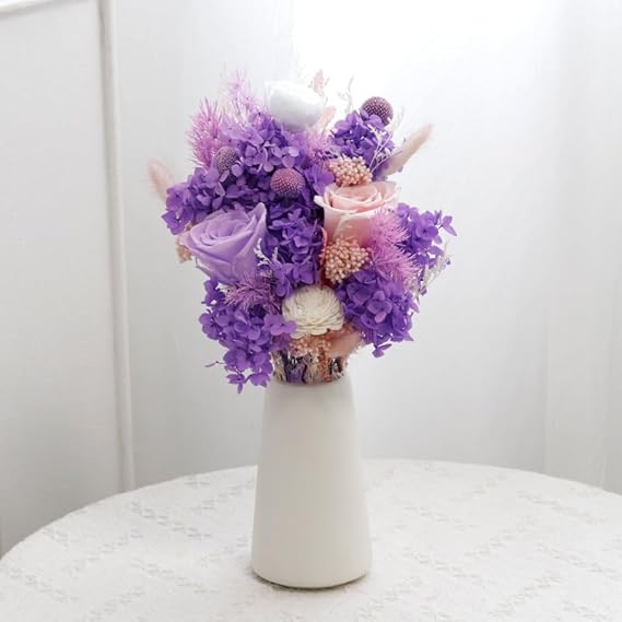 - Ribbon Flower Bouquet – Enjoy the timeless beauty of our preserved flower bouquet decorated with purple ribbons which is ideal alternative to fresh cut flowers with the enduring appeal of eternal roses and purple hydrangeas. These flowers are perfect for home décor or as a memorable gift maintaining their vibrant appearance indefinitely. Unlike fresh flowers our preserved bouquets offer a long lasting reminder of the thoughtful gift.
