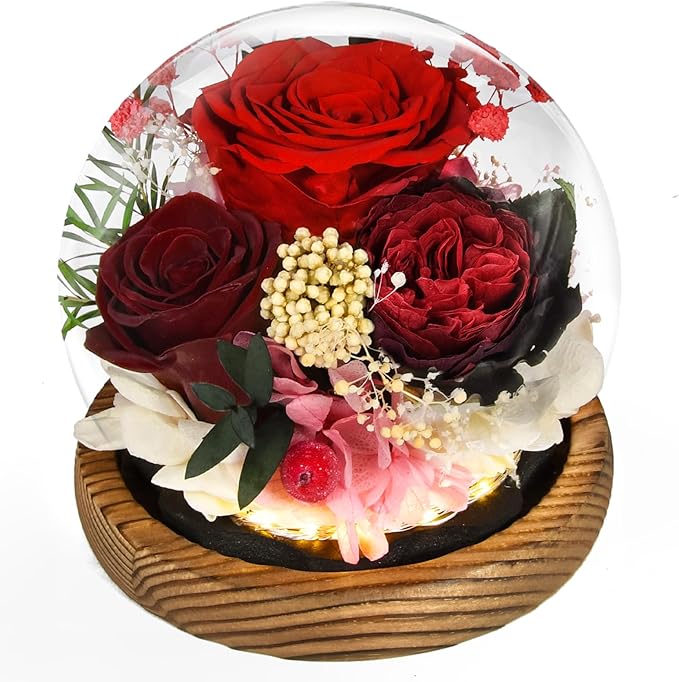 - Delicate design with glass cover and led light. The glass cover is of the highest quality to protect the flowers inside. Please prepare 3 aaa batteries in advance, install them and press the switch button at the bottom of wooden base, small led lights around roses will radiate warm and romantic glow, casting a spell of enchantment wherever they are placed. A romantic way to make a person feel special and meaningful when it comes to birthday, anniversary, Valentine’s day, mother’s day, Christmas.