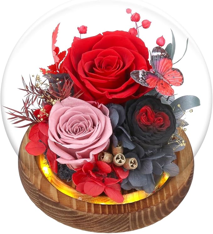 - 【Flowers Fresh Bouquet in Glass Dome】These elegant preserved flowers are covered under a glass dome with LED light embedded in the petals,giving you a stunning display during the day and night, We also add a beautiful butterfly ornament along with flowers which symbolizing luck and hope.It is not only an exquisite decoration but also a cute night light in the bedroom,every time when it turned on, it will bring unforgettable memories.