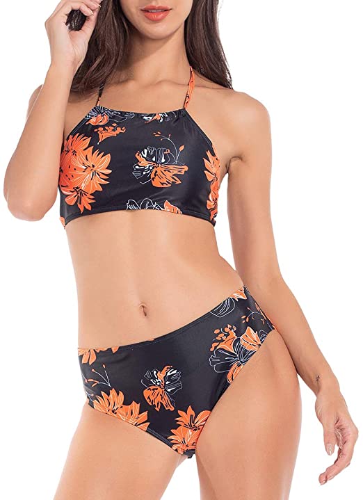 Lomantise Tropical Leaves Printed Halter High Neck Top Bikini Set Swimsuit for Women Two Piece Bathing Suit Swimwear