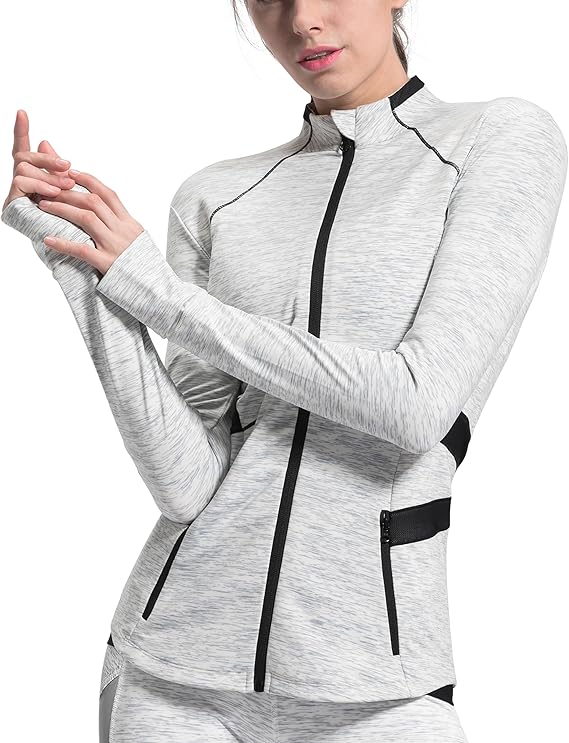 - Thumb Holes: Thumb holes keep the sleeves in place on your wrists, preventing the gym jacket for women from riding up during activities and offering extra warmth.