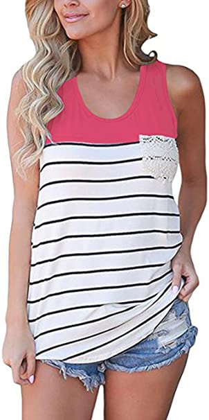 Round neck design, Colorblock neckline, Racerback tank top, Sleeveless shirts for women, Casual workout tops for women Classic striped design, Lace pocket on the front.