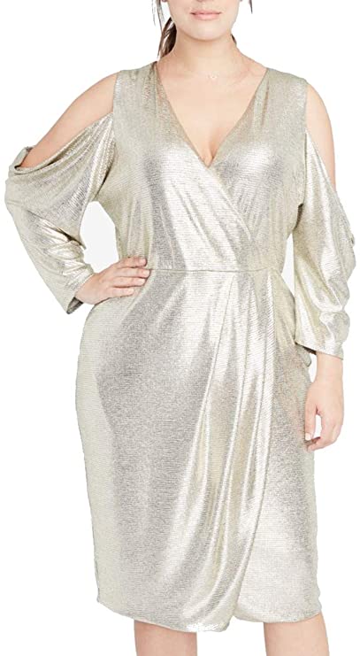 This wrap dress is totally ready for an evening out. The front slit balances a deep v neckline highlighted by a silver of shoulder. The metallic hue keeps it nothing but fun and ready to party.