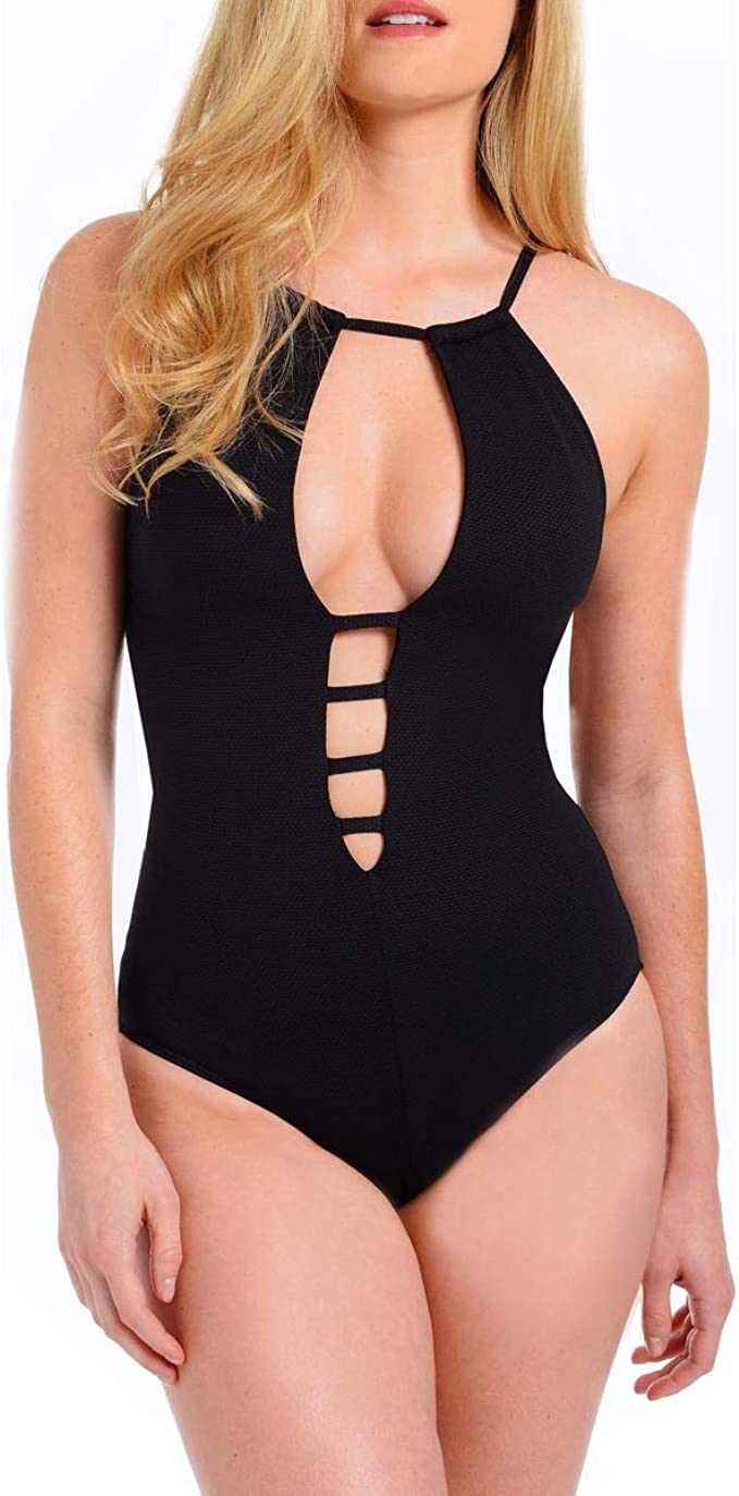 One piece swimsuit with top strap as closure at neck back bust strap closure