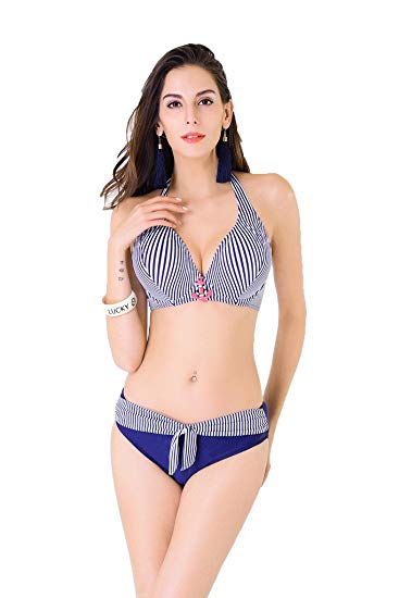 The bikini features is two piece stripe bandage halter bathing suit, an anchor in the front, self-tie bow, unique style, create a illusion for stunning curves.