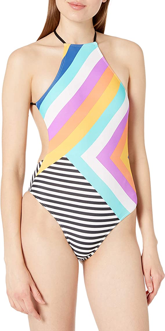 The surf candy one piece swimsuit features a colorful striped placed print.