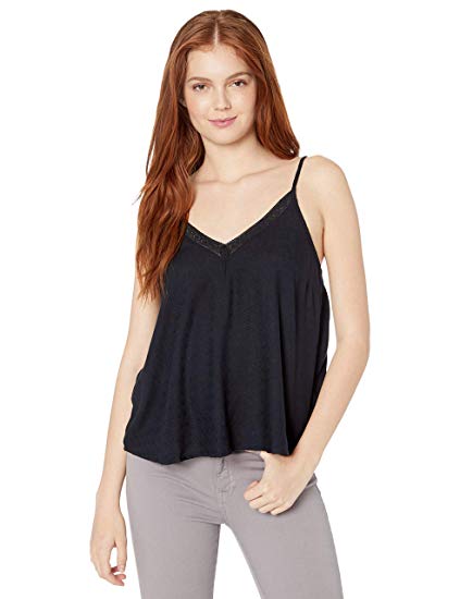 Strappy top for women. Features include: lightweight viscose dobby weave fabric, classic, comfortable regular fit, adjustable straps, lace insert on front of v-neckline.