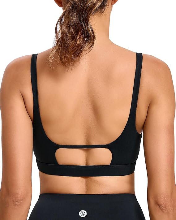 - [Low-Medium Support] Whether you’re practicing your downward dog in a yoga class or hitting the streets for a casual run, this backless sports bra provides a comfortable level of compression for your activities , Unlike high support sports bra. The delicate straps of black sports bra provide a secure and personalized fit, ideal for light activities that require flexibility. The chic strap of padded sports bra details enhance your silhouette and elevate your everyday look.