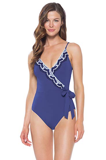 One piece surplice features two tone scallop trim and mock wrap front with bow. Offers removable soft cups, adjustable lingerie straps and open tie back.