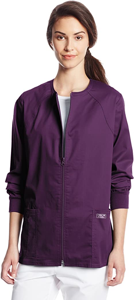 A round neck zip front warm-up jacket features two patch pockets, a right side pocket with a sectional pocket and I.D. loop, back yoke, back princess seams for slimming fit, and matching knit cuffs. Center back length: 27 inch.