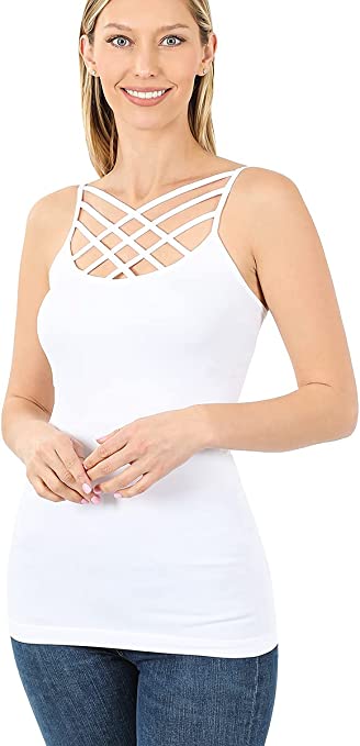 Ladies seamless triple criss-cross front cami. This makes a great layering piece that spices up any shirt, sweater or dress. Top is made of 92% Nylon and 8% Spandex.