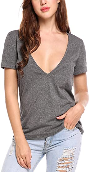 Deep V Neck,Low Cut, Really Sexy Tops, Loose Casual Style. A great V Neck Short Sleeve T-Shirt for summer days. The loose casual summer low cut shirts can pair well with jeans, shorts, skinny leggings etc, make you more sexy and stylish. Summer short sleeve v neck tops perfect for night out, weekend,workout,date,party or casual wear