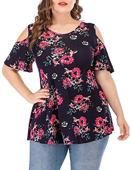 JollieLovin Women’s Plus Size Tops Floral Printing Cold Shoulder Tunic Short Sleeve V Neck T Shirts