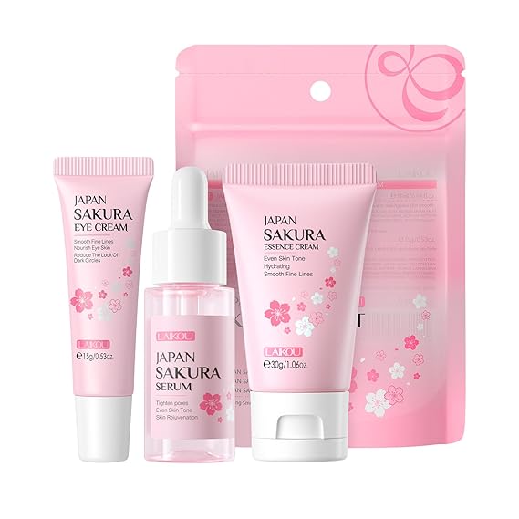 - Nourishes Skin: Toiletries travel kit is infused with cherry blossom extract. First, use serum to nourish the face; and then use eye cream to fade fine lines; finally, use essence cream to even skin tone, so that you can glow healthier