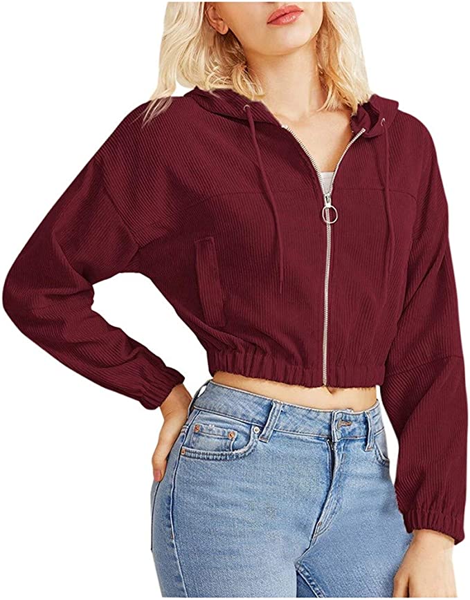 Softgirls Sweatshirt Loose Cropped Casual Hooded Pocket Jacket Solid Corduroy Sweatshirt Shirt Women Zip-Up