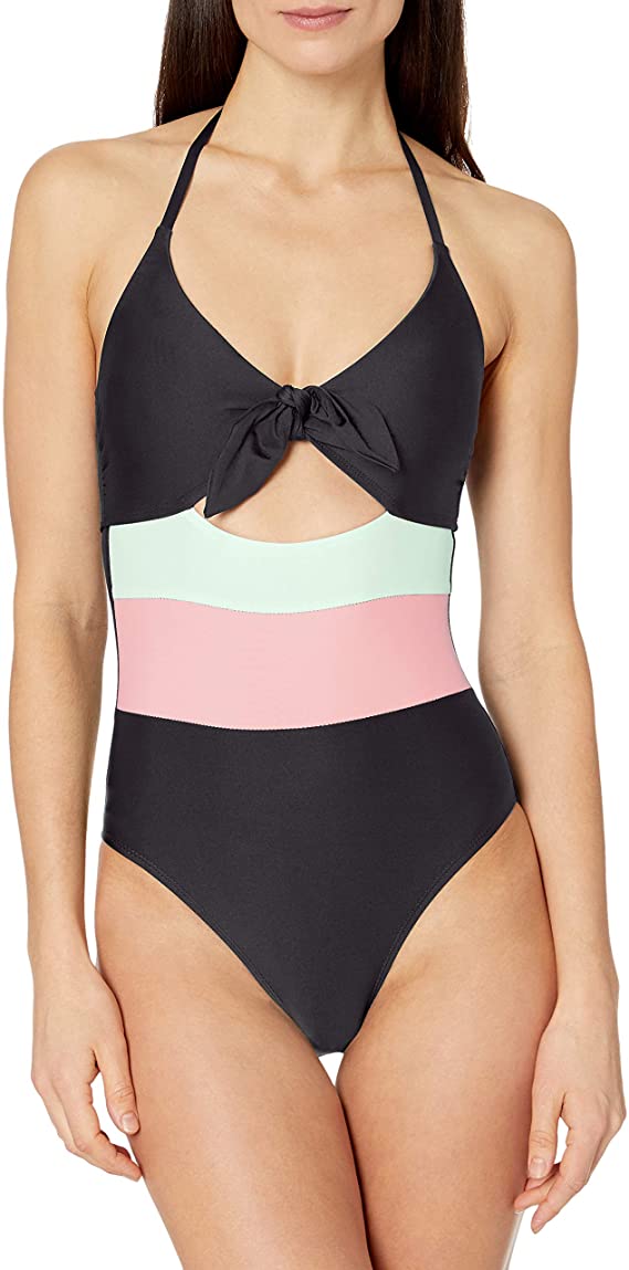 The Splendid tie front keyhole one piece swimsuit has front tie knot detail with a peek-a-boo opening under the bust. Complete with removable soft cups, side shirring, and full seat coverage. This swimsuit is designed with an open scoop back, clasp closure, and neck straps that tie for adjustability.