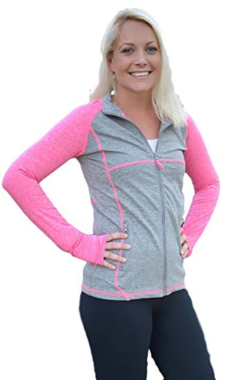 A must-have piece in any athletic women’s closet. With a full length zipper, this activewear ladies’ jacket is a perfect layering element in your athletic outfit. With a light grey body and contrasting pink stitching and sleeves, it is an all-year round favourite.