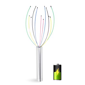 It is electric, feel free to use it manually of course, the way is very simple, get ready an AA battery, put it in, grab the handle, open the switch, first feel the vibration and then you are ready to go. Long and short steel wires in the head, only a few long wires will vibrate, massage contact beads in the head are made of environmentally friendly resin material, rub your scalp up and down, turn left and right, so the massager can fully touch your head. Less than 5-minutes use for each time is recommended, the massager can improve head blood circulation, relieve head fatigue. After use, you will feel your scalp is completely relaxed, trust me, this will definitely give you a great experience, worthwhile to get one at home and in office.