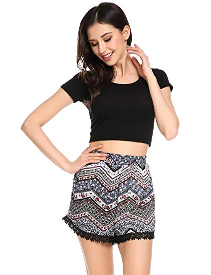 Feature:Elastic band high waist, lace trim / Casual summer beach mini shorts / Boho style