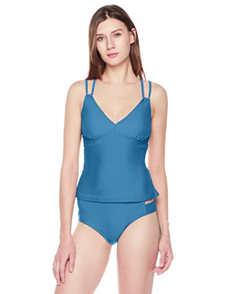 V-neck tankini top with cross-back straps and bottom in classic bikini cut with side details.