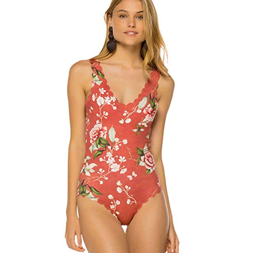 Floral pattern swimwear with scalloped trim looks very cutie.