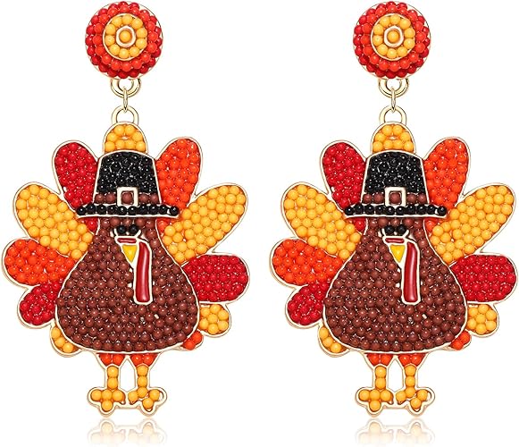 - ♥ Handmade Fall Earrings — Fall has finally arrived! Celebrate the vibrant colors, delicious smells, and cozy feelings of Autumn when you wear our Beaded Turkey Earrings! Elegant, chic and modern, these festive earrings are your new go-to accessory for this season. Perfect for the Thanksgiving holidays, fall celebrations, Christmas, Friends giving, family pics, etc. These drop earrings are perfect to show your gratitude for your loved ones in life and what they have given us this past year