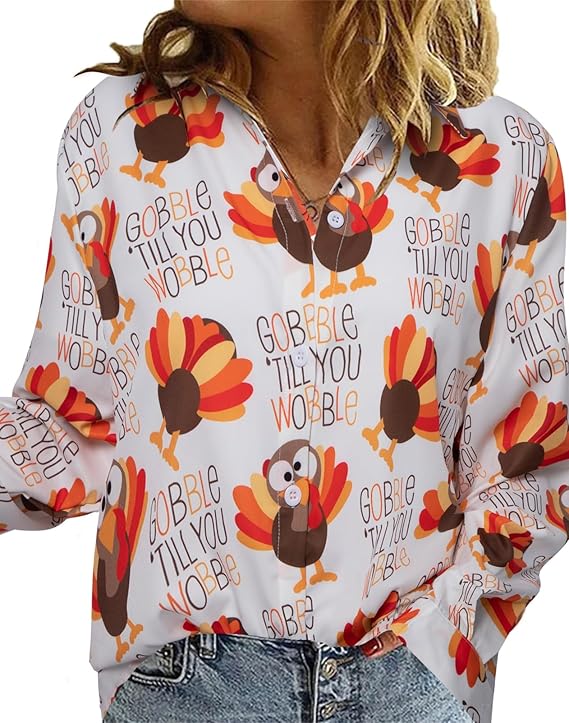 - FEATURES: Thanksgiving Shirt Women Turkey Shirts Thanksgiving Pumpkin Long Sleeve Button Down Blouse Thankful Grateful Blessed Fall Top. The classcal Button Down design will make the whole outfit look fashionable.