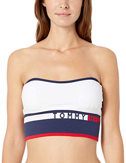Retro inspired sporty color blocked seamless bandeau bra by Tommy Hilfiger. Lightly padded silhouette with molded cups featuring a mesh back panel and contrasting logo elastic bust band. great for layering, comfortable, super soft, and made from lightweight, breathable stretch fabric.