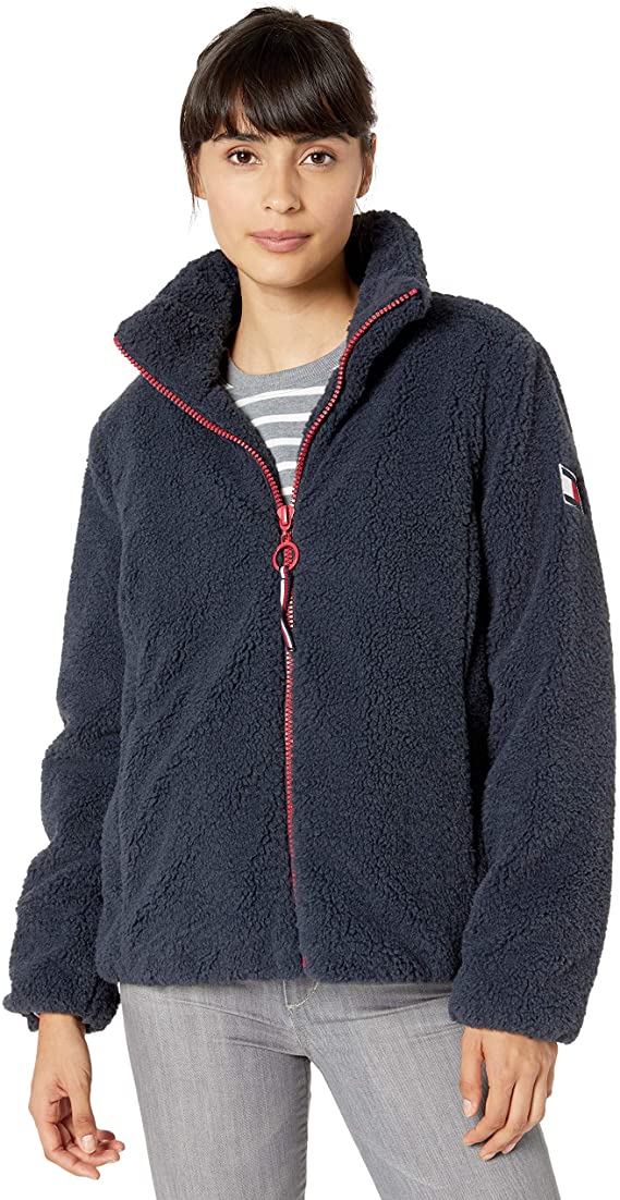 Super soft deep pile sherpa zip front jacket with iconic red, white and blue accents