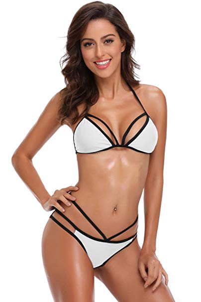 Crafted with nylon-spandex blend fabric, bikini top features self-tie straps and removable padds, makes you get a comfortable fit , also giving you a gentle support while you play in the waves. While cheeky cut bikini bottom provides minimal-to-moderate coverage, the tabbed sides give you a stylish on the modern bikini.