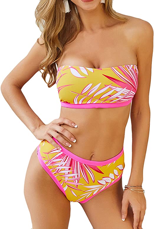 NOVMAY Women’s Bandeau Smocked Bikini Two Piece Strapless Bikini Tropical Leaf Bathing Suit High Waist Swimsuit Swimwear