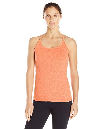 Material wicks sweat & dries really fast. Built-in shelf bra for covert shape & support. Super-skinny straps with kissback racer. Feminine scoop neck.