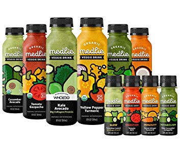Get a mix of our best-selling veggie drinks and shots from Medlie (formerly ZUPA NOMA). Each variety pack contains 6 veggie drinks and 4 veggie shots made from certified organic vegetables and superfoods. Drink flavors include Kale Avocado with Collagen, Yellow Pepper Turmeric, Cucumber Avocado, Tomato Gazpacho, Tomatillo Kale Jalapeno, and Carrot Coconut — plus our Superfood Shots for Digestion (Tomato Apple Cider Vinegar), Immunity (Carrot Ginger Turmeric), Metabolism (Kale Cucumber Jalapeno), and Glow (Cucumber Lemon with Collagen).