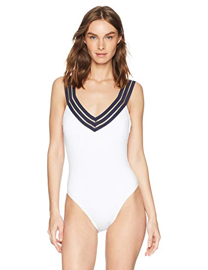 Stompin in my stilettos solid colored V-neck one piece swimsuit featuring colored elastic trim with an X back style