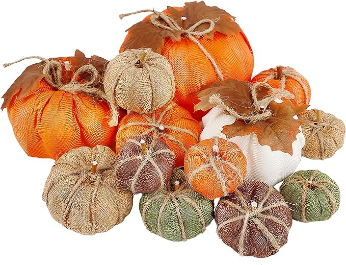 Winemana Thanksgiving Decorations Artificial Pumpkins, Set of 12 Mixed Sizes Burlap Pumpkin with Leaves, Harvest Holiday Party Indoor Home Kitchen Props