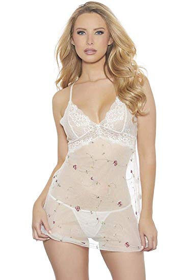 It’s your time to bloom! Rival the beauty of the flowers in this romantic babydoll set featuring sheer lace cups, adjustable criss- cross spaghetti straps, a lace underbust panel, a sheer mesh skirt with an allover floral design, and a matching g-string panty.