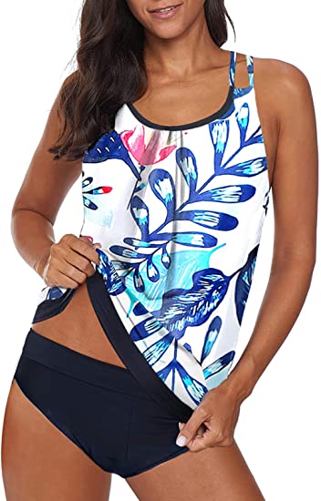 - Summer Beachwear Blouson Floral Printed Tankini Top with Bikini Bottom Bathing Suits Two Piece Swimsuit