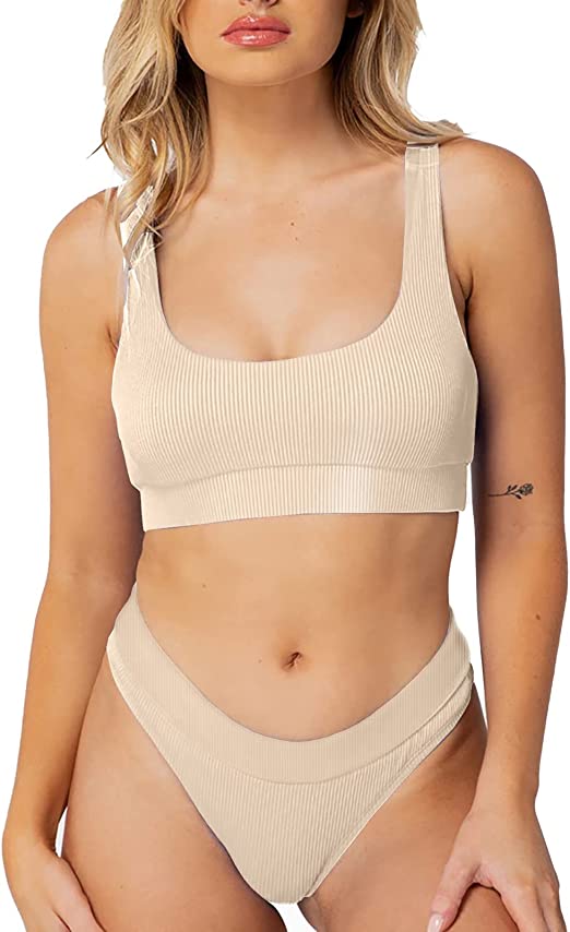 -Top come with removable cups,the bottom is well fitting but also very stretchy. The high waist is super cute and is a little cheeky.