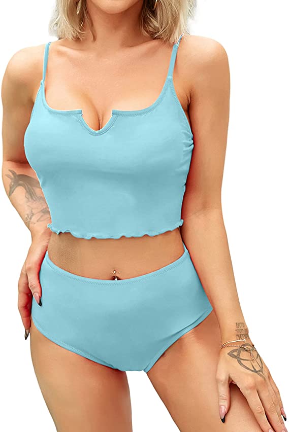 This two-piece swimsuit is uniquely designed with a V-cut top and ruffled elasticated hem, paired with high-waisted belly pants to show off your style. You deserve the sexy ruffle bikini set two piece this summer!