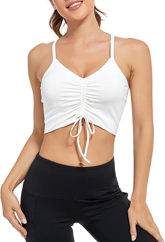 - 【Longline Strappy Sports Bra】 V Neck Racerback, sleeveless, fabric Soft and fashion, Drawstring Front , make the body more attractive, supportive sports bras built-in detachable cup, And the elastic in the inner lining feels firm and applies pressure for your breast.